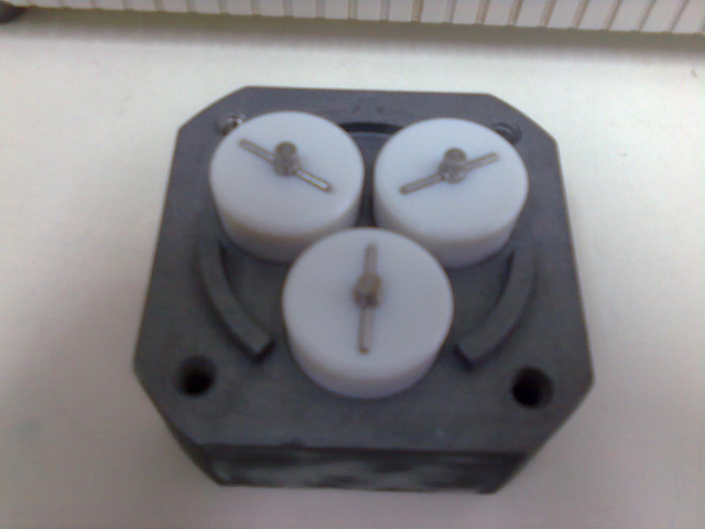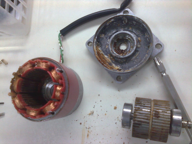 馬達前端有固結成膏狀的培養基,後端有鹽類結晶。不能運作也是很合理地,連漆包線表面都有膏狀的培養基。